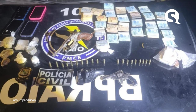 Na ação, foram apreendidos dois revólveres, várias munições de diversos calibres, Maconha, Cocaína, celulares e quase vinte e oito mil reais.