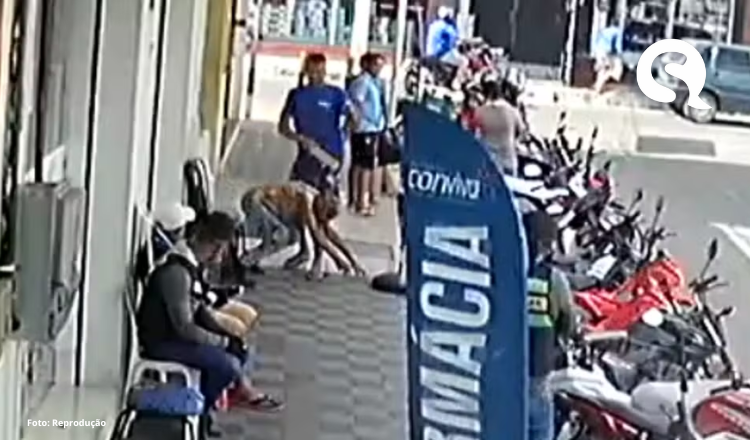 As imagens mostram a vítima, sentada em uma cadeira na calçada, sendo surpreendida e atingida por um golpe