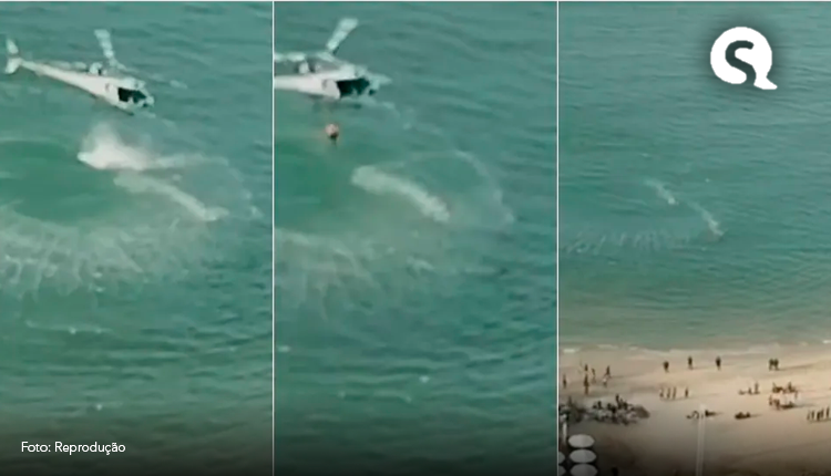 Vídeos feitos por moradores do bairro registram o momento em que o helicóptero sobrevoa a área, cerca o jovem, e o agente pula para o mar. (Assista no vídeo acima)