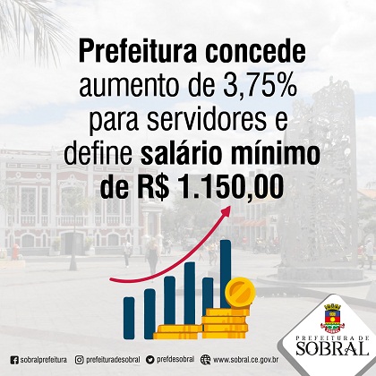 O prefeito Ivo Gomes anunciou, em reunião nesta terça-feira (29/01) com membros do Sindicato dos Servidores Públicos Municipais de Sobral (SINDSEMS), que o salário mínimo do município para servidores será de R$ 1.150,00, valor acima do definido pelo Governo Federal (R$ 998,00). Além disso, o prefeito anunciou aumento de 3,75% para todos os servidores, conforme o Índice de Preços ao Consumidor Amplo (IPCA), e aumento de 6% para profissionais do magistério.