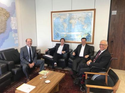 Cumprindo agenda nesta quinta-feira (19/04) em Brasília, o prefeito Ivo Gomes se reuniu com o ministro da Ciência, Tecnologia, Inovações e Comunicações, Gilberto Kassab, com o presidente da Sociedade Brasileira para o Progresso da Ciência (SBPC), Ildeu de Castro, e com o presidente do Conselho Nacional de Desenvolvimento Científico e Tecnológico (CNPQ), Mário Borges, a quem pediu apoio para as comemorações e lançamento de um selo especial em homenagem ao centenário da comprovação da teoria da relatividade em Sobral.