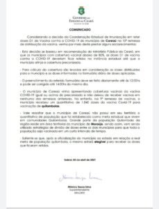 A prefeitura do município de Coreaú por meio de nota da secretaria de Saúde do Estado, informou que sempre manteve a vacinação em dia, porém em seu último lote recebeu vacinas para comunidade quilombola e o número de vacinados era inferior ao número de vacinas recebidas, onde a população de maior número de quilombolas era da cidade de Moraújo, a nota diz ainda, que em virtude desta realidade, as doses do município serão liberadas.