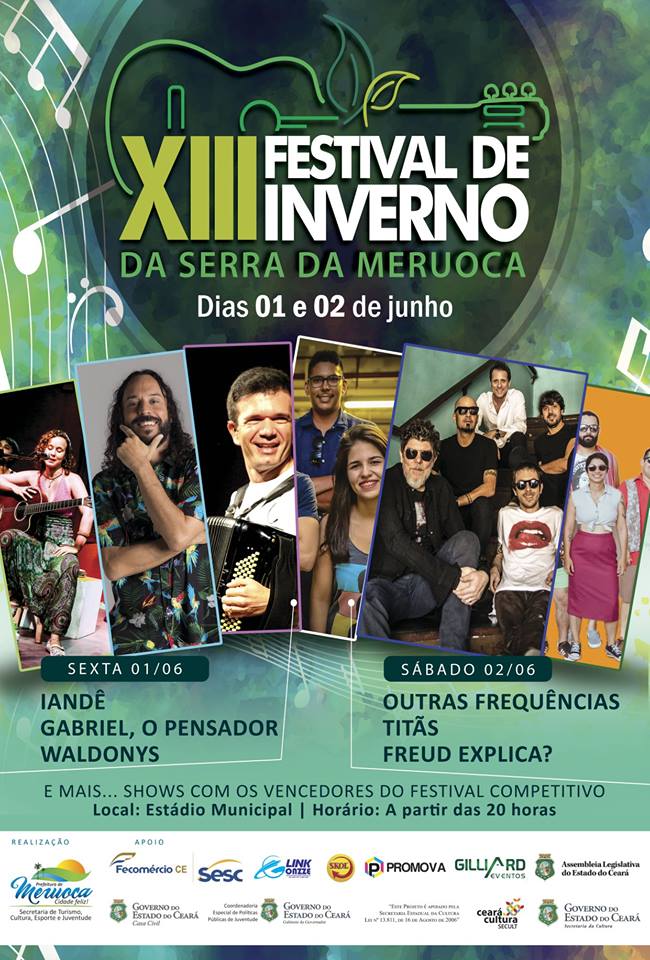Estão abertas as inscrições da 13ª edição do Festival de Inverno da Serra da Meruoca. O evento acontecerá nos dias 1 e 2 de junho. Os artistas ou bandas devem inscrever seus trabalhos exclusivamente pela internet (AQUI). Todos serão avaliados, não por uma única música, mas por suas várias obras.