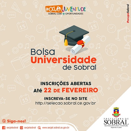 A Prefeitura de Sobral, por meio da Secretaria da Cultura, Juventude, Esporte e Lazer (Secjel), integrando o Programa#ocupaJuventude, torna pública as inscrições para o Projeto Bolsa Universidade de Sobral 2019. Contemplando estudantes universitários que estejam cursando o 1º e 2º semestre, o projeto atende preferencialmente jovens moradores dos distritos de Sobral e egressos da rede pública de ensino médio. As inscrições vão até 22 de fevereiro.