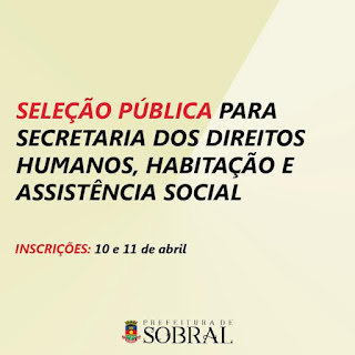 A Prefeitura de Sobral recebe inscrições, entre os dias 10 e 11 de abril, para seleção pública e contratação temporária para 206 vagas para a Secretaria dos Direitos Humanos, Habitação e Assistência Social. O edital foi publicado nesta terça-feira (04/04), no Diário Oficial do Município, e as vagas são destinadas a profissionais de nível fundamental, médio e superior.