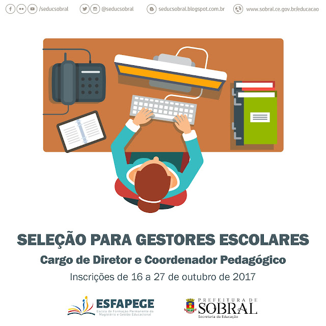 A Prefeitura de Sobral, por meio da Secretaria da Educação, abriu inscrições, nesta segunda-feira (16), para seleção pública para os cargos de diretor e coordenador pedagógico. Para participar do processo seletivo, os candidatos devem ter ensino superior completo em Pedagogia ou áreas afins.