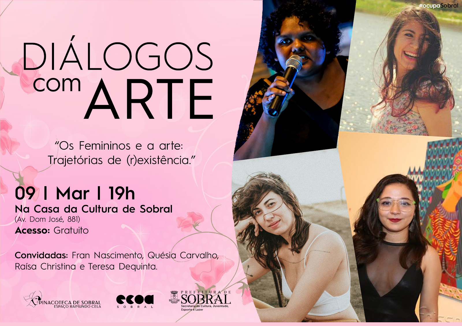 A Prefeitura de Sobral, por meio da Secretaria da Cultura, Juventude, Esporte e Lazer (SECJEL), e Escola de Cultura, Comunicação, Ofícios e Artes (Ecoa), realiza nessa sexta-feira (09), a partir das 19 horas, na Casa da Cultura de Sobral, a oitava edição do Projeto ‘Diálogos com Arte’. Dessa vez aborda o tema “Os Femininos e a arte: Trajetórias de (r)existência”.