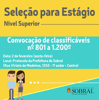 Visando preencher vagas remanescentes, também foram convocados os classificáveis do nº 801º a 1200º, para apresentação de documentos, até sexta-feira (02/02), das 8h às 12h e das 13h às 17h, na sala de protocolo da Prefeitura de Sobral, situada na Rua Viriato de Medeiros, 1250, 1º andar – Centro. Saiba mais: (88) 3677-1139.