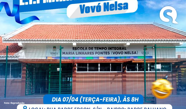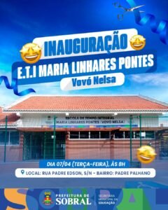 A Prefeitura de Sobral, por meio da Secretaria da Educação, realiza nesta terça-feira (07/04) a cerimônia de inauguração da Escola de Tempo Integral Maria Linhares Pontes, localizada no bairro Padre Palhano. A nova unidade representa mais um importante investimento na ampliação e qualificação da rede municipal de ensino.