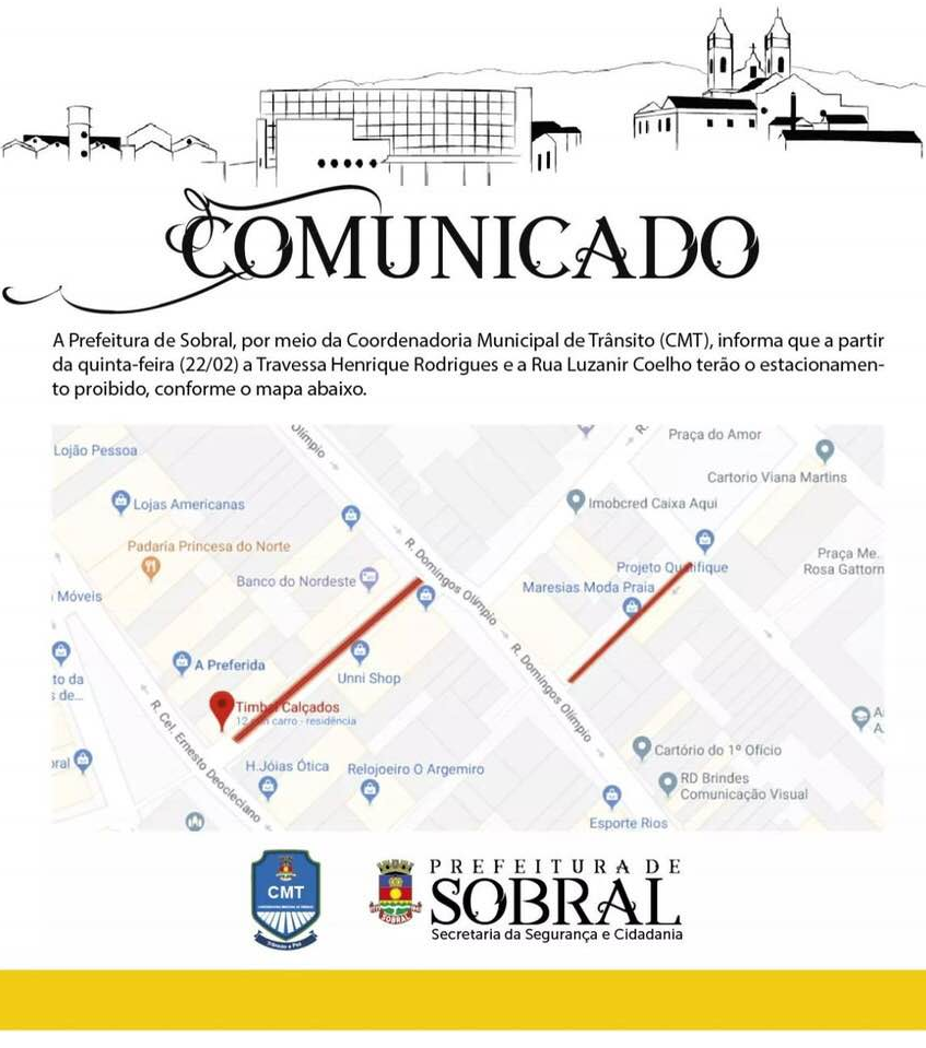 A Prefeitura de Sobral, através da Coordenação Municipal de Trânsito, comunica aos sobralenses que a partir desta quinta-feira, 22 de fevereiro de 2018, fica proibido o estacionamento de carros e motocicletas na extensão da Rua Luzanir Coelho, entre as ruas Anahid Andrade e Cel. José Sabóia, no conhecido Beco dos Celulares, e na Travessa Dr. Henrique Rodrigues, entre a praça Mons. Linhares e a rua Domingos Olímpio, no centro comercial da cidade.
