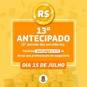 A Prefeitura de Sobral pagará no dia 15 de julho a primeira parcela do décimo terceiro salário dos servidores da administração pública direta e indireta do município. Será pago também na mesma data o terço das férias dos profissionais do magistério.