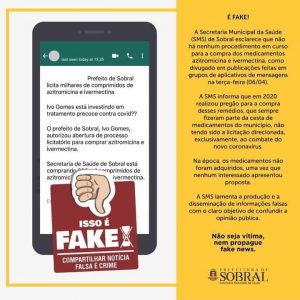 A Prefeitura de Sobral através da Secretaria Municipal da Saúde (SMS) de Sobral esclarece que não há nenhum procedimento em curso para a compra dos medicamentos azitromicina e ivermectina, como divulgado em publicações feitas em grupos de aplicativos de mensagens na terça-feira (06/04).