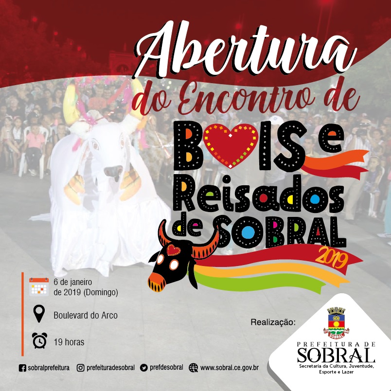 Em comemoração ao Dia de Reis, a Prefeitura de Sobral, por meio da Secretaria da Cultura, Juventude, Esporte e Lazer (Secjel), realiza, neste domingo (06/01), a abertura do “Encontro de Bois e Reisados de Sobral”. O evento ocorre a partir das 19 horas, no Boulevard do Arco. A festa de tradição da cultura popular local reunirá o Boi Caiçara, o Boi Paz no Mundo e o Boi Mina Flor.