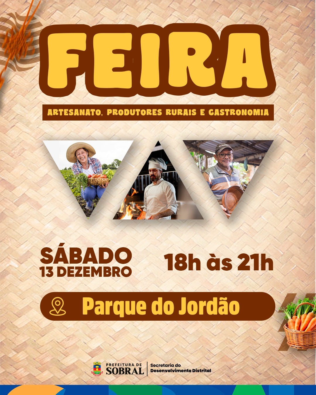 A Prefeitura de Sobral, por meio da Secretaria do Desenvolvimento Distrital, realiza no sábado (13/12), uma Feira de Artesanato, Gastronomia e Produtos Rurais no distrito do Jordão. O evento acontecerá das 18h às 21h, no Parque do Jordão, em frente à igreja, com foco na valorização dos empreendedores locais e no fortalecimento da economia do território.