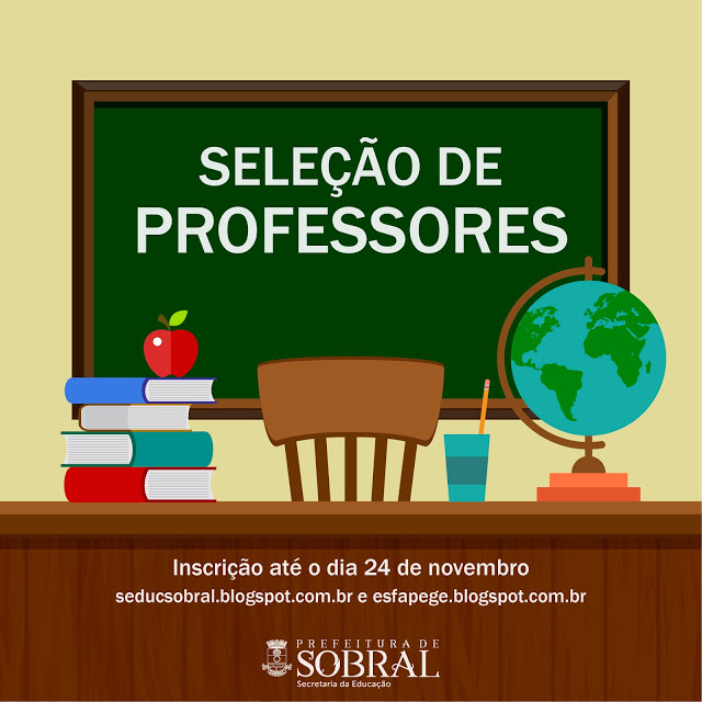A Prefeitura de Sobral, por meio da Secretaria da Educação, promoverá seleção pública formação de um banco de professores da Rede Municipal de Ensino. As inscrições deverão ser realizadas de 16 a 24 de novembro, na página da Secretaria da Educação (AQUI).