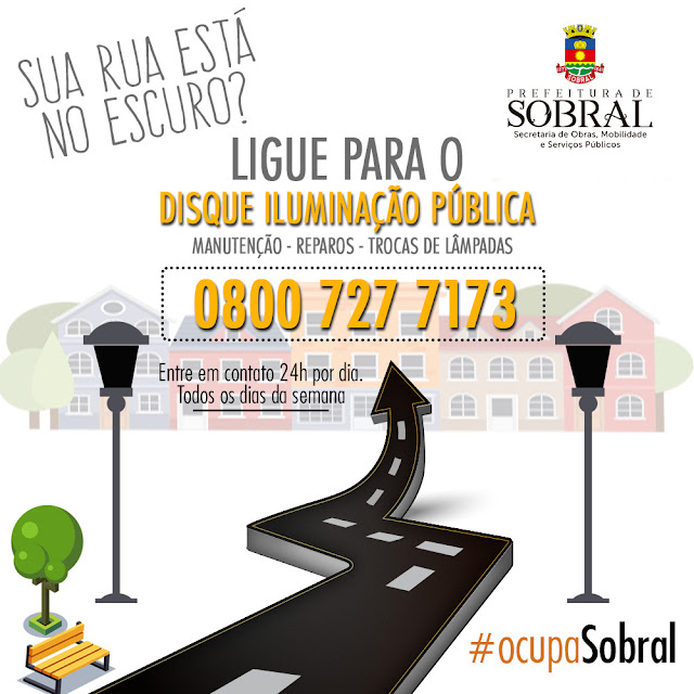 Através do número 0800-727-7173, o ‘Disque Iluminação Pública’ da Prefeitura de Sobral, a população pode solicitar demandas para a manutenção de luminárias em praças, ruas e avenidas da cidade. Esta ação é desenvolvida pela Secretaria de Obras, Mobilidade e Serviços Públicos (Secomp), juntamente com a empresa Citelum, empresa ganhadora da licitação para executar o serviço.