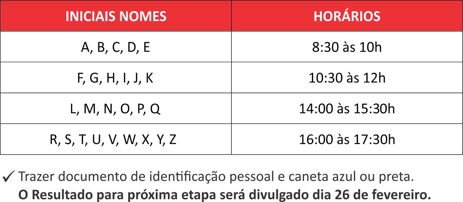 A primeira etapa, que acontecerá na próxima segunda-feira (22), consiste na aplicação de redação, sendo responsabilidade do candidatos conferir nome e horário de realização de sua prova (conforme tabela abaixo).  Já a segunda etapa, será realizada entre os dias 29 de fevereiro e 3 de março  e será composta por oficinas de aptidão. A terceira e última fase se dará através do encaminhamento para as empresas participantes do Projeto.