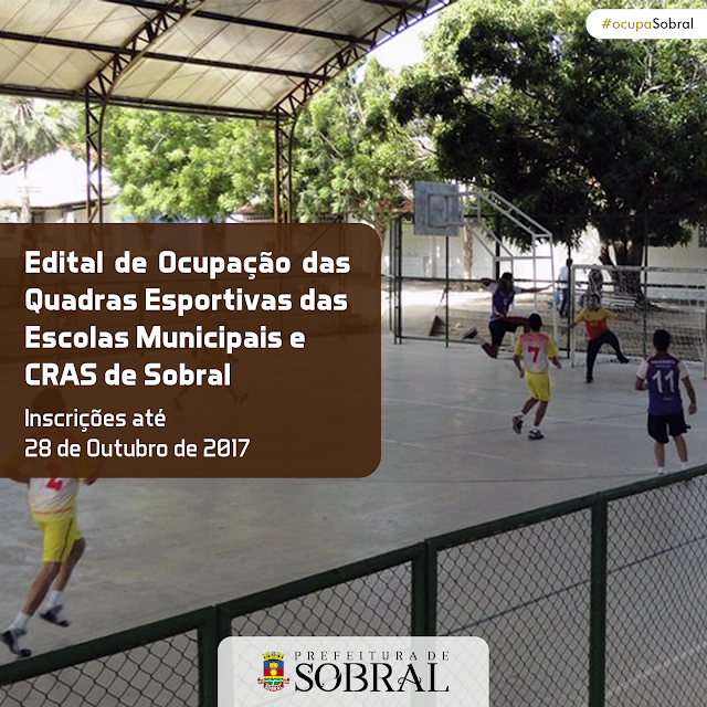 Com o objetivo de democratizar e expandir o uso dos equipamentos esportivos para toda a comunidade, a Prefeitura de Sobral lançou, nesta segunda-feira (16/10), o Edital de Ocupação das Quadras Esportivas das Escolas Municipais e do CRAS dos bairros Cidade José Euclides I e II, Vila União e Residencial Nova Caiçara. As inscrições seguem abertas até o próximo dia 28 de outubro, reforçando o programa #ocupaSobral.