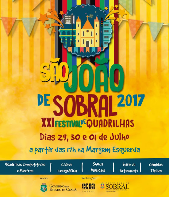 A Prefeitura de Sobral, por meio da Secretaria da Cultura, Juventude, Esporte e Lazer (Secjel) e da Escola de Comunicação, Ofícios e Arte (ECOA), realizará, durante os dias 29, 30 e 01 de julho, a partir das 17h, na margem esquerda do Rio Acaraú, o São João de Sobral 2017, que vem repleto de atrações e atividades culturais, dentre elas a cidade cenográfica, o 21° Festival de Quadrilhas Juninas de Sobral, feira de artesanato e shows musicais.