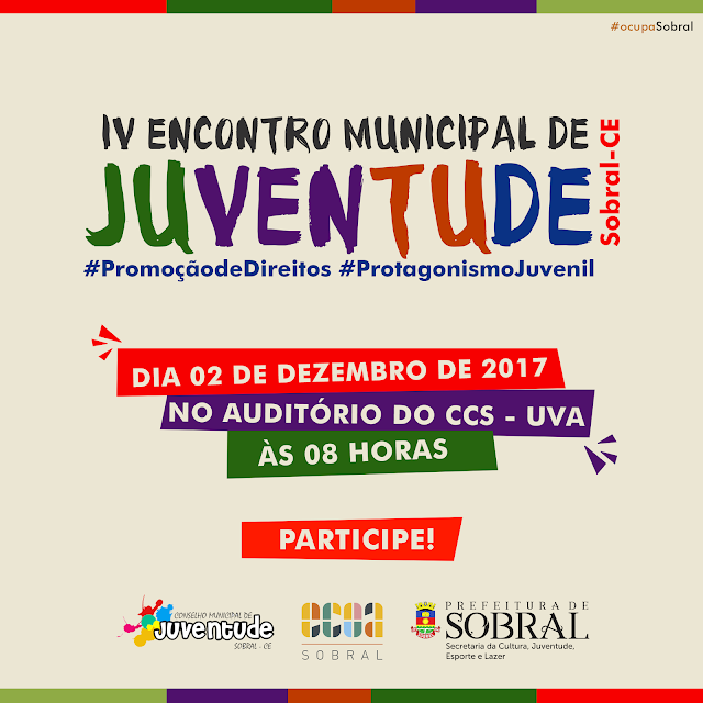 Para discutir e propor políticas públicas para as juventudes de Sobral, será realizado no sábado (02/12), a partir das 8h, no Centro de Ciências da Saúde – CCS/UVA, o IV Encontro Municipal de Juventude, que irá reunir diversas entidades juvenis, ONG’s que trabalham com juventude, além da sociedade civil em geral da sede e distritos de Sobral.