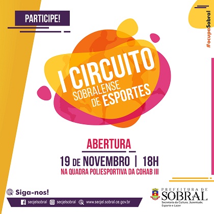 Com o objetivo de fomentar e potencializar o desenvolvimento do esporte de rendimento no município, a Prefeitura de Sobral, por meio da Secretaria da Cultura, Juventude, Esporte e Lazer (Secjel) e a Associação de Arbitragem e Eventos, realiza, nesta segunda-feira (19/11), a partir das 18 horas, a solenidade de abertura do I Circuito Sobralense de Esportes, na quadra poliesportiva da Cohab III.