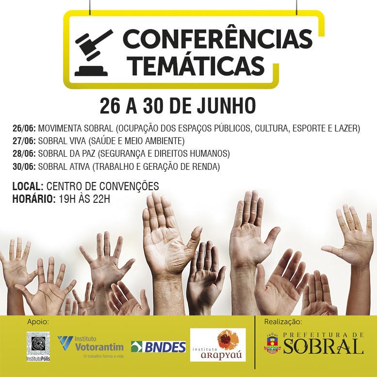 As conferências serão realizadas no Centro de Convenções, a partir das 19h, e trabalharão as seguintes temáticas: Movimenta Sobral (26/06), Sobral Viva (27/06), Sobral da Paz (28/06) e Sobral Ativa (30/06). Em seguida, iniciarão as ações participativas no território, sendo a primeira no próximo dia 3 de julho, na Escola estadual Cesário Barreto, em Taperuaba.