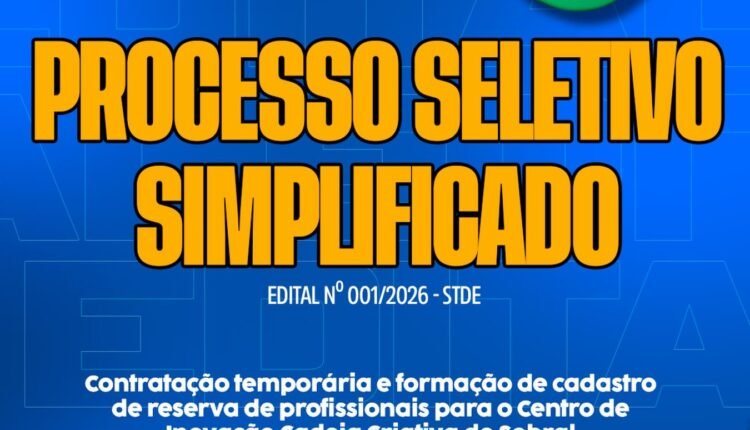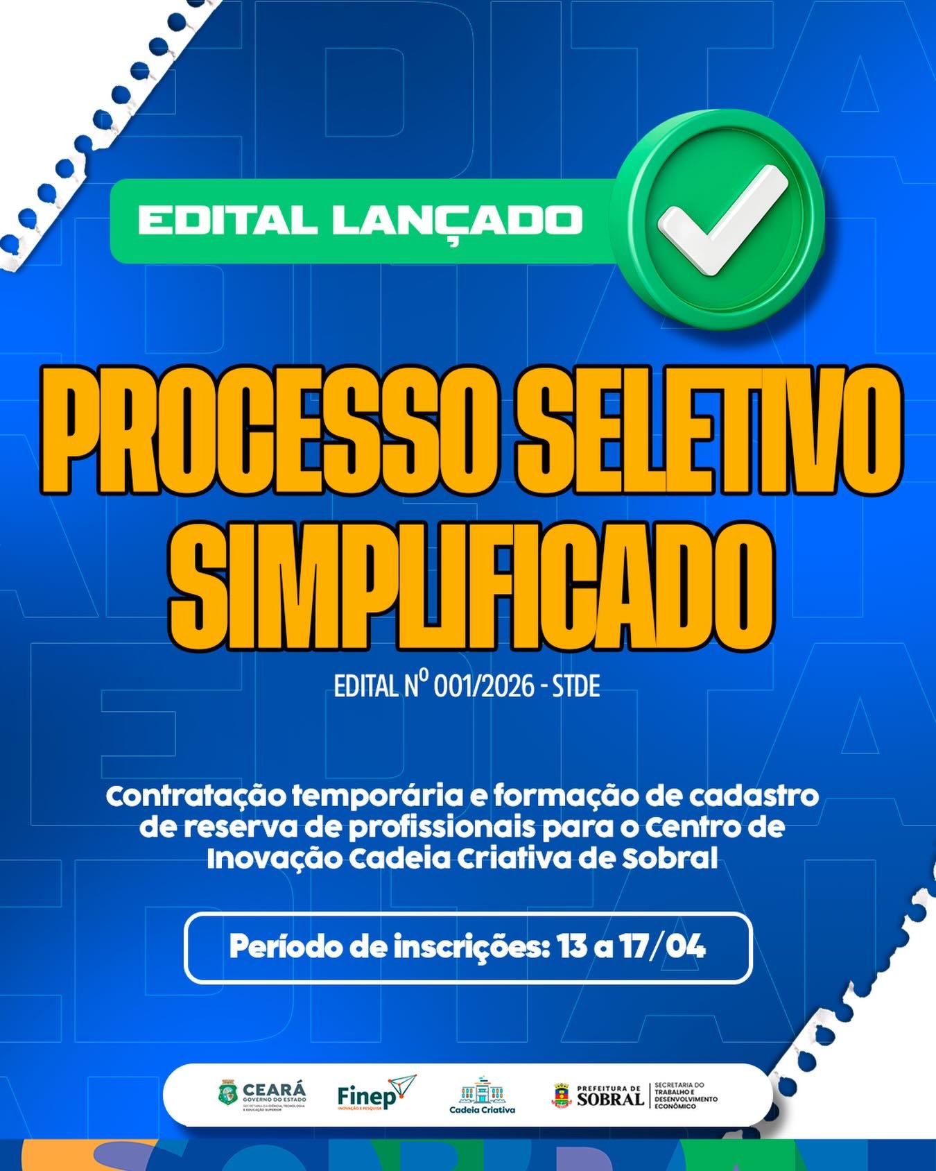 O Centro de Inovação da Cadeia Criativa de Sobral está com inscrições abertas para o Processo Seletivo Simplificado promovido pela Prefeitura. São 6 vagas disponíveis, com salários que podem chegar a R$ 6.000 e inscrição gratuita.