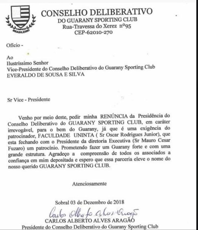 Atendendo as exigências do empresário Oscar Rodrigues, que condicionou sua ajuda ao Guarany somente se tivesse o controle total do clube, inclusive do Conselho Deliberativo, o presidente do Conselho, Carlos Alberto Alves Aragão, encaminhou carta renuncia ao seu vice Everardo Sousa e Silva (Veras), nesta segunda-feira (3). “Se for para o bem do nosso time, não seremos nós que seremos empecilho. Pelo contrário, sempre estivemos aqui para ajudar”, declarou Carlos.