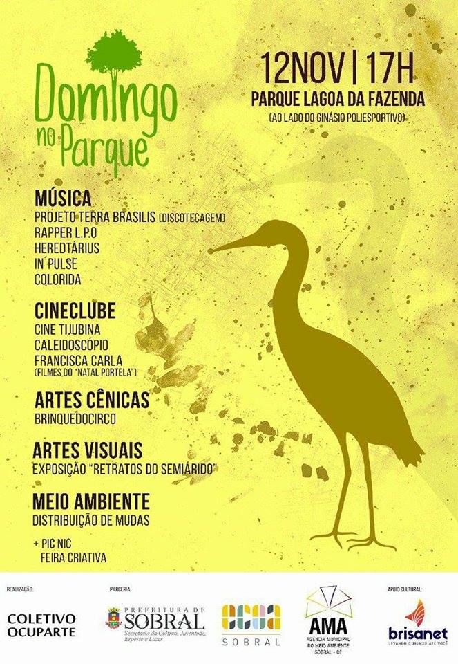 O projeto Domingo no Parque Sobral 19ª edição é uma realização do Coletivo Ocuparte e conta com a parceria da Secretaria da Cultura, Juventude, Esporte e Lazer de Sobral – SECJEL e do Instituto ECOA.