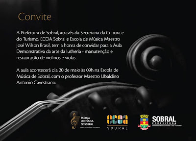 A Escola de Música Maestro José Wilson Brasil promoverá, nesta terça-feira, 20 de maio, às 9h, na Escola de Música, aula demonstrativa da arte da Luteria – manutenção e restauro de violinos e viola, que será ministrada pelo Prof. Maestro Ubaldino Antonio Cavestrano. O evento é promovido pela Prefeitura de Sobral, por meio da Secretaria da Cultura e do Turismo e do Instituto Ecoa.