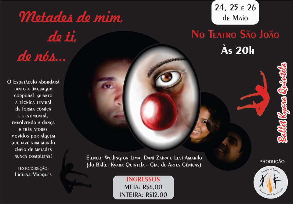 O Theatro São João apresenta, nesse fim de semana (dias 24, 25 e 26 de maio), o Espetáculo “Metade de Mim, de Ti, de Nós”, do Grupo Danças & Eventos. Com direção de Liduina Marques e coreografias de Kyara Quintela, a apresentação abordará tanto a linguagem corporal quanto a técnica teatral de forma cômica e sentimental, envolvendo a dança e três atores movidos por alguém que vive num mundo cheio de metades nunca completas.
