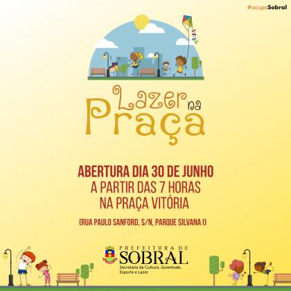 A Prefeitura de Sobral, por meio da Secretaria da Cultura, Juventude, Esporte e Lazer (Secjel), lançará, neste sábado (30/06), o projeto ”Lazer na Praça”. A primeira edição ocorrerá na Praça Vitória (Rua Paulo Sanford, S/N, Parque Silvana I, em frente ao portão da fábrica 2 da Grendene), a partir das 7 horas, disponibilizando jogos populares, ginástica rítmica, futebol de travinha, atividades recreativas, gincana esportiva e outras práticas voltadas para crianças. O projeto será realizado quinzenalmente e visa incentivar a prática esportiva e proporcionar lazer nas praças da sede e dos distritos do município.