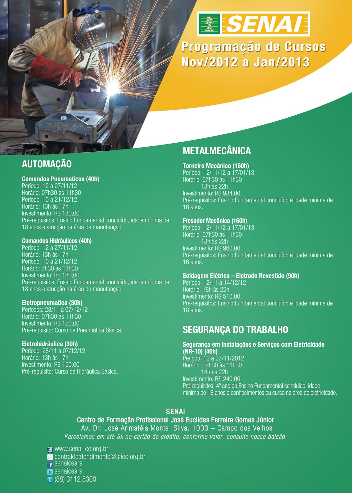 Estão abertos os cursos do SENAI de Sobral, tendo cursos nas áreas de automação, metalmecânica e segurança do