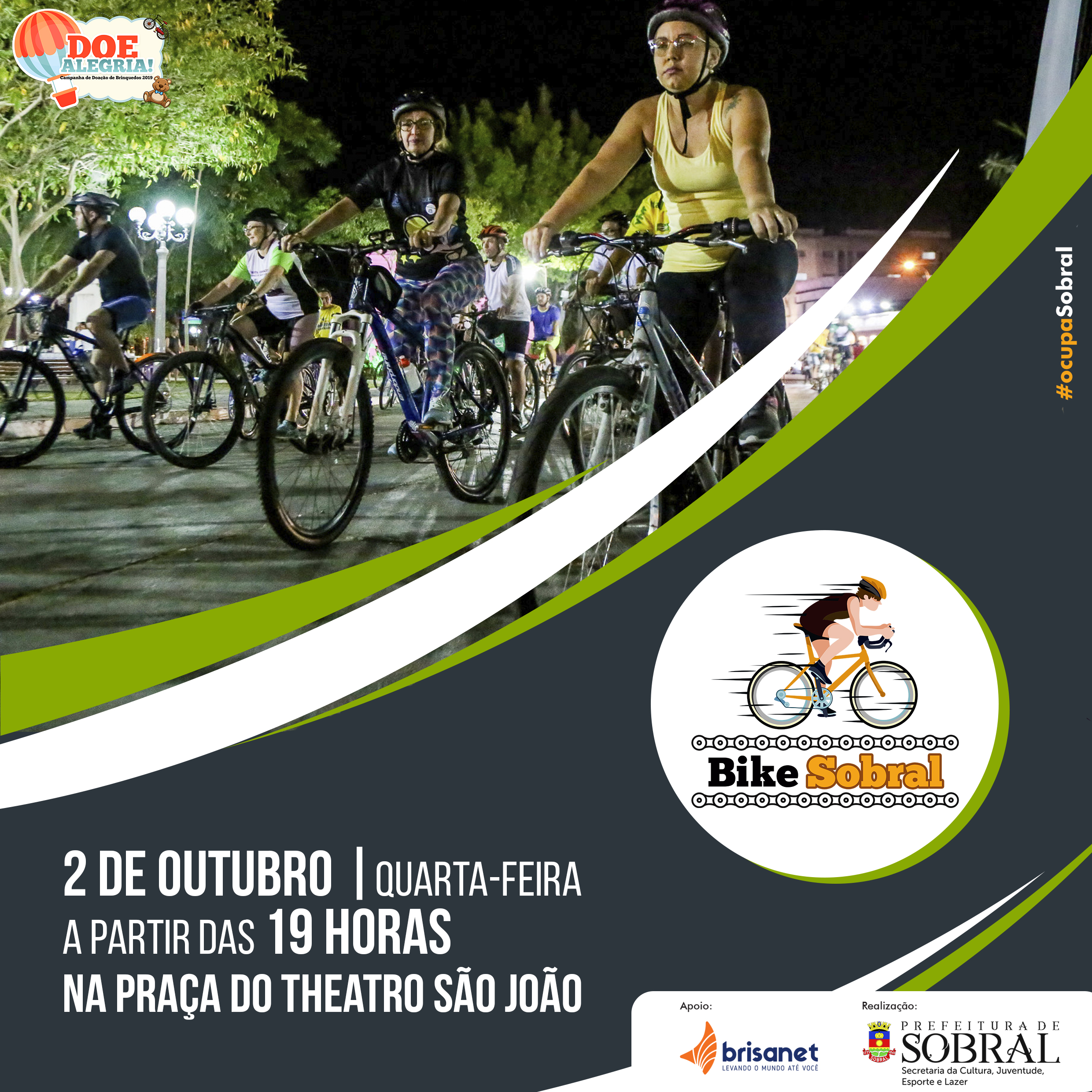 A Prefeitura de Sobral, por meio da Secretaria da Cultura, Juventude, Esporte e Lazer (Secjel), realizará, nesta quarta-feira (02/10), mais uma edição do passeio ciclístico “Bike Sobral”. Com concentração a partir das 19 horas, na Praça do Theatro São João, o passeio percorre as principais ruas da cidade.
