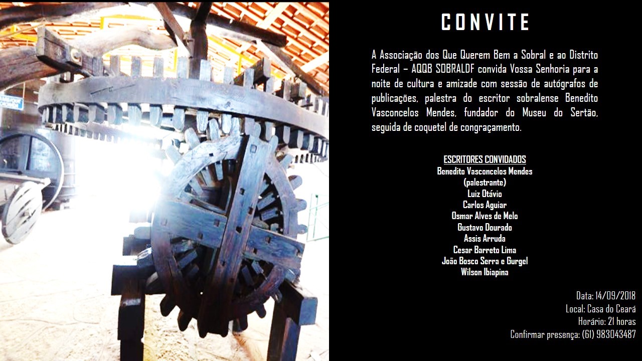 Transmito convite relativo a evento promovido pela AQQB SOBRALDF tendo como palestrante principal o respeitado professor Benedito Vasconcelos Mendes, nosso conterrâneo, uma das maiores personalidades do ensino e da pesquisa agropecuária no Brasil. Conto com a divulgação do amigo pela importância e pela repercussão no âmbito do estudo da cultura popular cearense.