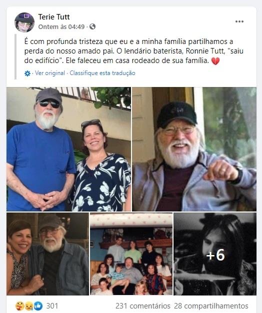 “É com profunda tristeza que minha família e eu compartilhamos a perda de nosso amado pai”, escreveu a herdeira do baterista. A causa da morte não foi informada.