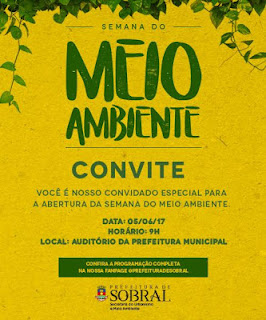 A Prefeitura de Sobral, por meio da Secretaria do Urbanismo e Meio Ambiente (Seuma) e da Autarquia Municipal do Meio Ambiente (AMA), estará realizando, de 5 a 8 de junho, a Semana do Meio Ambiente 2017. Com o tema “Educação Ambiental e a Política Nacional dos Resíduos Sólidos”, a campanha terá início nesta segunda-feira (05/06), às 9h, no auditório do Paço Municipal, com apresentação da banda de música, palestra e discussão sobre preservação do meio ambiente.