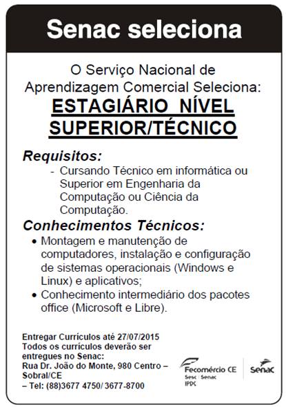 Notícias Senac Sobral está com seleção aberta para estágio em nível superior e técnico On 21 jul 2015 Compartilhar