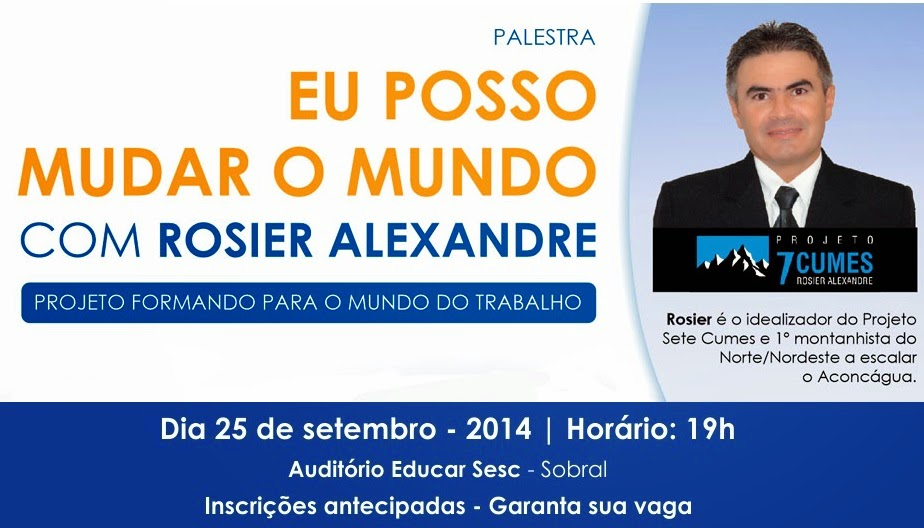 O Serviço Nacional de Aprendizagem Comercial do Ceará (Senac/CE) traz a Sobral, Rosier Alexandre, o primeiro montanhista do Norte e Nordeste a escalar o Aconcágua, para ministrar a palestra “Eu Posso Mudar o Mundo”.