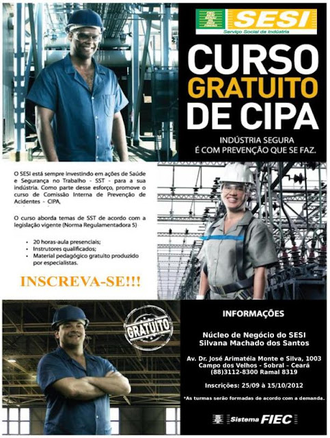 O Centro Integrado do SESI SENAI em Sobral promove em breve, um curso para formação em Comissão Interna de Prevenção de Acidentes –CIPA, com abordagem das do tema Segurança e Saúde do Trabalhador seguindo as normas vigentes. O curso é gratuito e voltando para trabalhadores das industrias sobralenses, e as turmas serão formadas de acordo com a demanda.