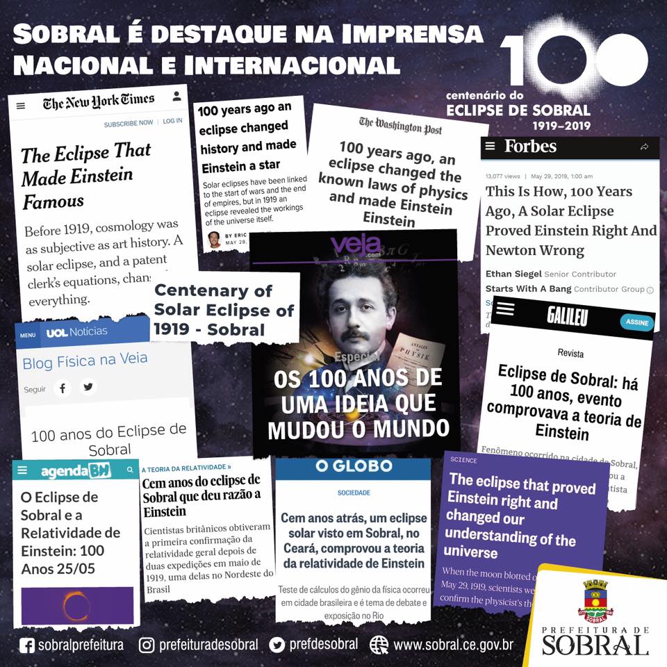 O Centenário do Eclipse de Sobral foi destaque na imprensa mundial. Os jornais norte-americanos The New York Times (um dos mais influentes do mundo) e Washington Post ressaltam a importância do evento para a ciência. Na Europa também houve grande repercussão na imprensa e no meio científico. No Brasil, jornais impressos e televisivos também destacaram os 100 anos de comemoração da comprovação da Teoria Geral da Relatividade em Sobral. Para marcar a data, o município contou com um extenso calendário de eventos que incluiu seminários, teleconferência internacional, apresentações artísticas e reinauguração do Museu do Eclipse.