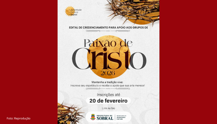 A Secretaria da Juventude e Cultura de Sobral, vinculada à Prefeitura de Sobral, torna público o Edital de Credenciamento de Grupos de Paixão de Cristo que irão compor a programação oficial dos espetáculos cênicos da Semana Santa 2026 no município de Sobral.