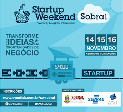 O Startup Weekend, maior rede de eventos de startups do mundo, aporta pela primeira vez em Sobral nos próximos dias 14 a 16 de novembro. Com foco em inovação e empreendedorismo, o evento acontece em torno de ideias para negócios no setor tecnológico com baixo custo inicial, mas com grande potencial de crescimento. O público alvo do evento são profissionais das áreas de negócios, marketing, relações públicas e empreendedores em geral, designers gráficos, engenheiros de software, programadores e desenvolvedores.