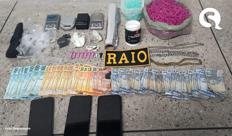 Durante a abordagem e verificação do material, os policiais constataram a presença de substâncias entorpecentes e objetos relacionados à comercialização de drogas. Ao todo, foram apreendidos aproximadamente 53 gramas de substância análoga a crack, 110 gramas de substância análoga a cocaína, nove pinos contendo cerca de 6,10 gramas de cocaína, 13 gramas de substância análoga a maconha, quatro balanças de precisão, três smartphones, três cordões na cor prata, três cordões na cor ouro, cerca de 1.200 pinos vazios utilizados para acondicionamento de cocaína e dinheiro em espécie.