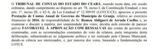 O Tribunal de Contas do Estado do Ceará – TCE/CE, em sessão ordinária, no último dia 31 de março de 2023, POR UNANIMIDADE DE VOTOS, emitiu parecer FAVORÁVEL pela APROVAÇÃO das contas de governo, relativas ao exercício financeiro do ano de 2016, de responsabilidade do ex-prefeito e atual Deputado Estadual Romeu Aldigueri.