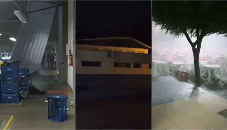 Portão derrubado em Quixeramobim; cobertura de posto de saúde arrancada em Pedra Branca e mesas e cadeiras arrastadas por ventania em Boa Viagem. — Foto: Reprodução – Com informações do G1 CE.