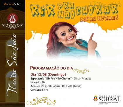 O Theatro São João recebe, neste domingo (12/08), a partir das 20 horas, o espetáculo “Rir Pra Não Chorar”, da YouTuber e comediante Dinah Moraes, que ainda é roteirista e diretora da peça. Baseada na história de vida e experiências da comediante, a obra apresenta costumes e tradições do povo cearense de forma criativa e espontânea.