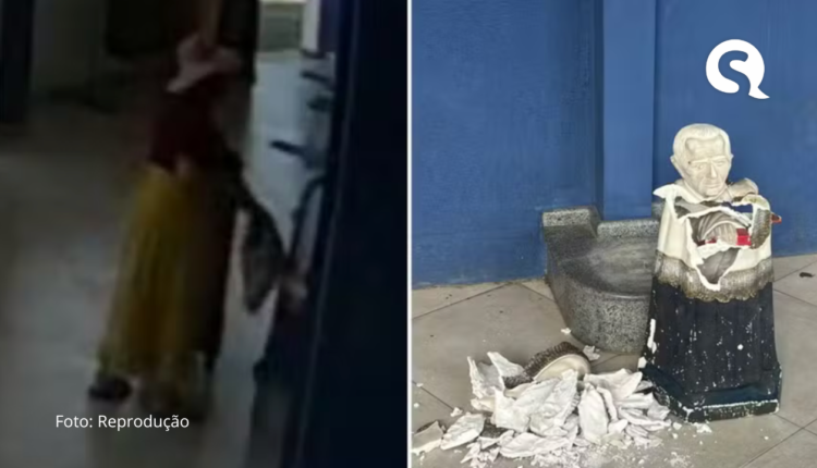 O caso ocorreu por volta das 13h20 e foi registrado por câmeras de segurança. As imagens mostram a idosa com uma mala e uma bolsa. Em seguida, ela se aproxima da estátua e a atinge com a bolsa. Logo depois, usa as mãos para derrubar a imagem no chão, que se parte com o impacto.