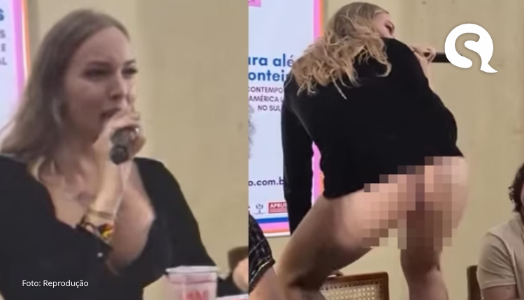 A historiadora e cantora Tertuliana Lustosa protagonizou performance erótica durante palestra na Universidade Federal do Maranhão (UFMA), nesta quinta-feira (17/10). Em vídeo, é possível vê-la subindo em uma cadeira, levantando o vestido e expondo suas partes íntimas. “Educando com o cu”, diz a influenciadora no fim da apresentação. Autora da música “Murro na costela do viado”, do grupo “A Travestis”, ela soma 26,9 mil seguidores no Instagram.