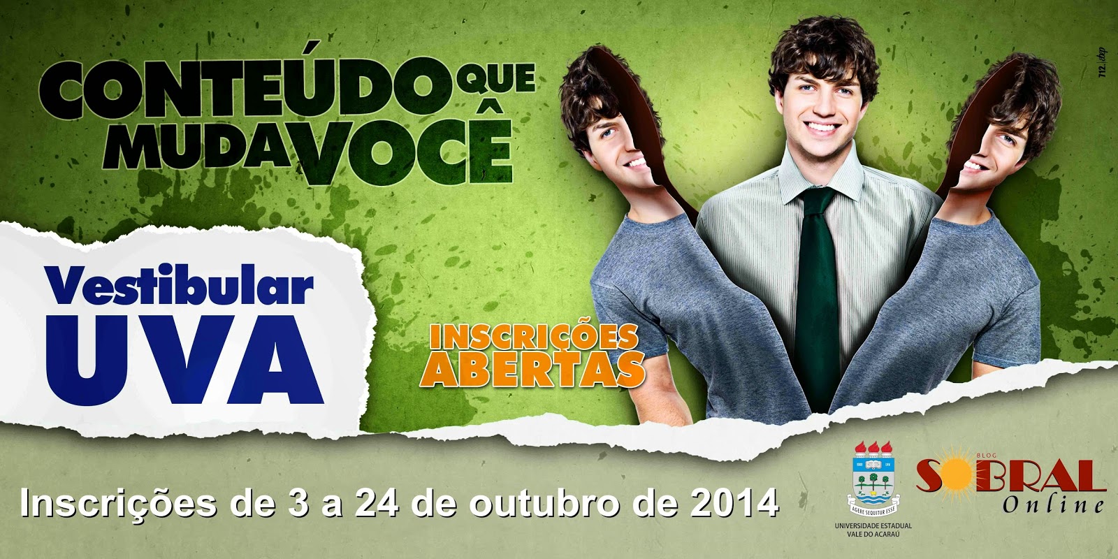 Estarão abertas no período de 3 a 24 de outubro de 2014 as inscrições para o processo seletivo 2015.1 da Universidade Estadual Vale do Acaraú (UVA), em Sobral, zona Norte do Ceará. As inscrições serão recebidas exclusivamente via Internet. Os candidatos poderão acessar o endereço eletrônico Vestibular.uvanet.br.